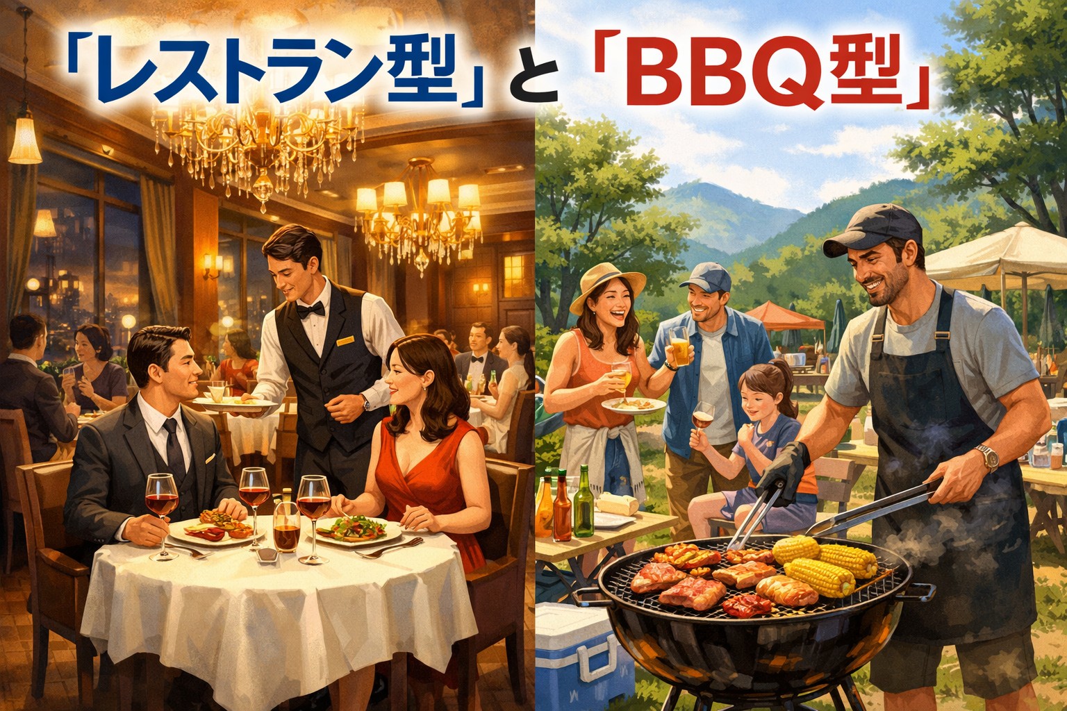 ビジネスにおけるサービス提供には、「レストラン型」と「BBQ型」という考え方があります。