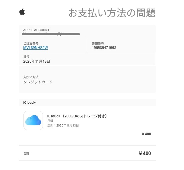Appleから(iCloud200GBストレージ)の「お支払いの問題」というタイトルでメールが来ました。